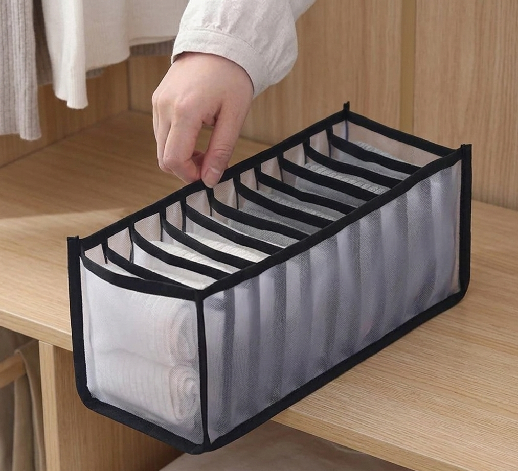 The 11-grid underwear and socks organizer is a foldable storage solution designed to keep your undergarments neatly arranged and easily accessible. Made from durable, breathable mesh, it helps maximize space and maintain an organized wardrobe.