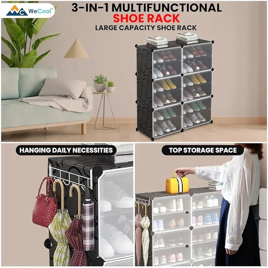 ?【??????? ???????】This versatile plastic shoe rack organizer, able to accommodate up to 24 pairs of shoes, doubles as storage for bags and clothing. Its space-saving side hooks offer a handy spot to hang hats or keys