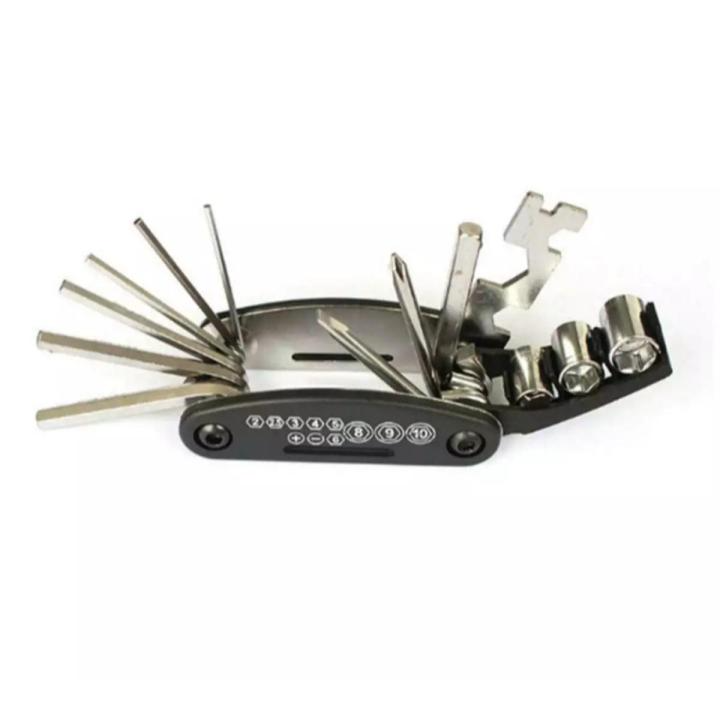 16 functions in one tool – includes wrenches, screwdrivers, tire levers, and more