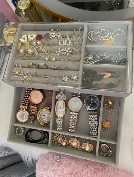Keep your jewellery neat and safe with this 3-drawer storage box. The soft velvet lining protects your rings, earrings, and necklaces from scratches, while the clear acrylic cover lets you easily see your collection. Its compact and stylish design makes it a perfect addition to your dressing table. Available in Pink, Grey, and Beige.