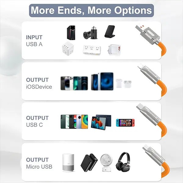 3-in-1 Design – Type-C + Lightning + Micro USB