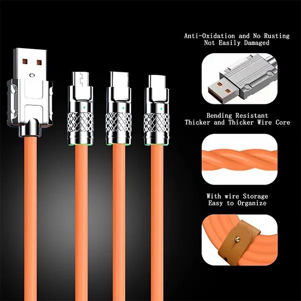 Upgrade your charging experience with the 3-in-1 Zinc Alloy Fast Charging Cable 120W — designed for speed, durability, and convenience. With three built-in connectors (Type-C, Lightning, and Micro USB), this single cable allows you to charge multiple devices without carrying extra wires.