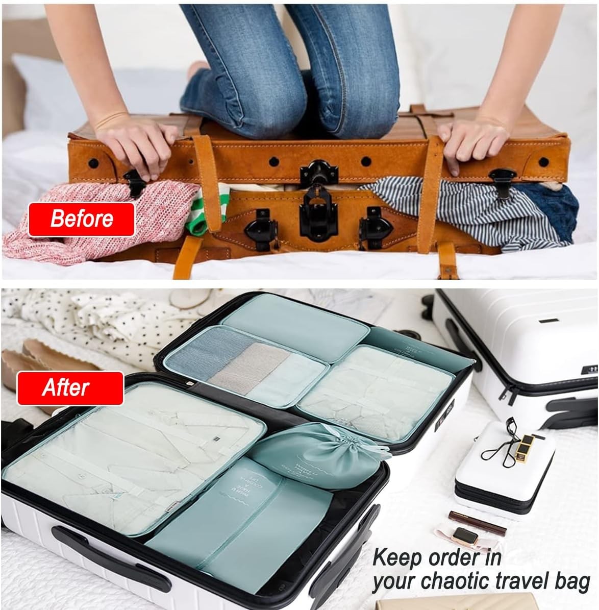 The 7 Pcs Luggage Packing Organizer Set helps you pack smarter and stay organized during any trip. Designed with breathable, lightweight materials, each bag offers dedicated space for clothes, undergarments, toiletries, and accessories. This set reduces clutter and maximizes suitcase space, making your travel experience smoother and more efficient.