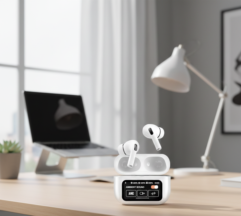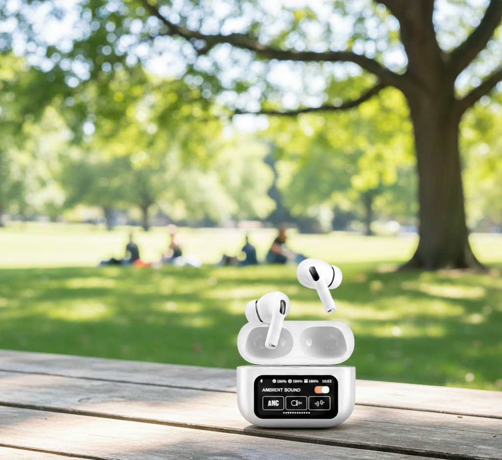 4.2-inch LED touch display on charging case – shows real-time battery levels (earbuds & case), connection status, and charging progress