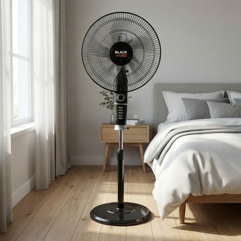 Beat the heat with the Black+Ford Falcon (BL-SF100), a premium 16-inch pedestal fan designed to deliver powerful, consistent airflow to any room. Unlike standard fans, the Falcon features an advanced 5-leaf blade system paired with a heavy-duty motor, ensuring a whisper-quiet yet high-velocity breeze that reaches every corner of your living space. Its robust build is engineered for durability, making it the perfect companion for those long summer days and nights where reliable cooling is a necessity. This fan doesn't just move air; it transforms your indoor environment. With a unique 4-speed control panel and a built-in 60-minute mechanical timer, you have complete authority over your comfort level. Whether you need a gentle whisper for sleep or a high-powered gust for a crowded living room, the Falcon adapts to your needs. Its wide-angle oscillation and adjustable height ensure that everyone in the room stays cool, while the one-year warranty provides the long-term peace of mind you deserve from a top-tier home appliance.