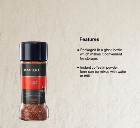 Bring the café experience to your home with Davidoff Rich Aroma Instant Coffee 100g – sophistication, convenience, and flavor in every cup.