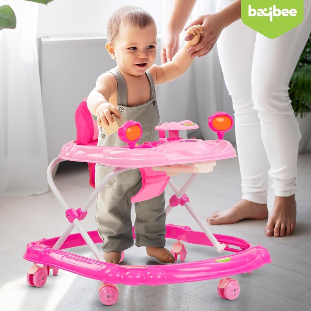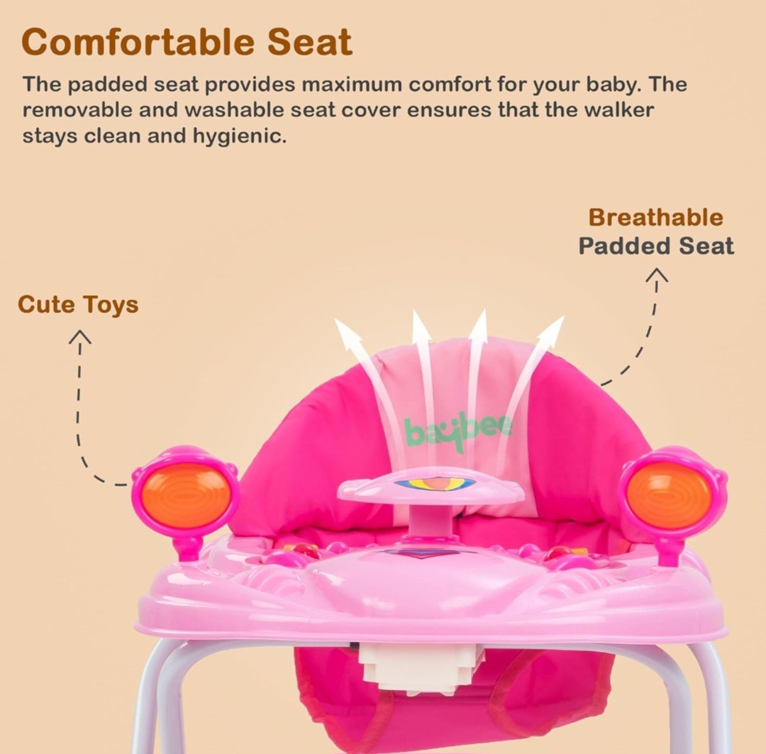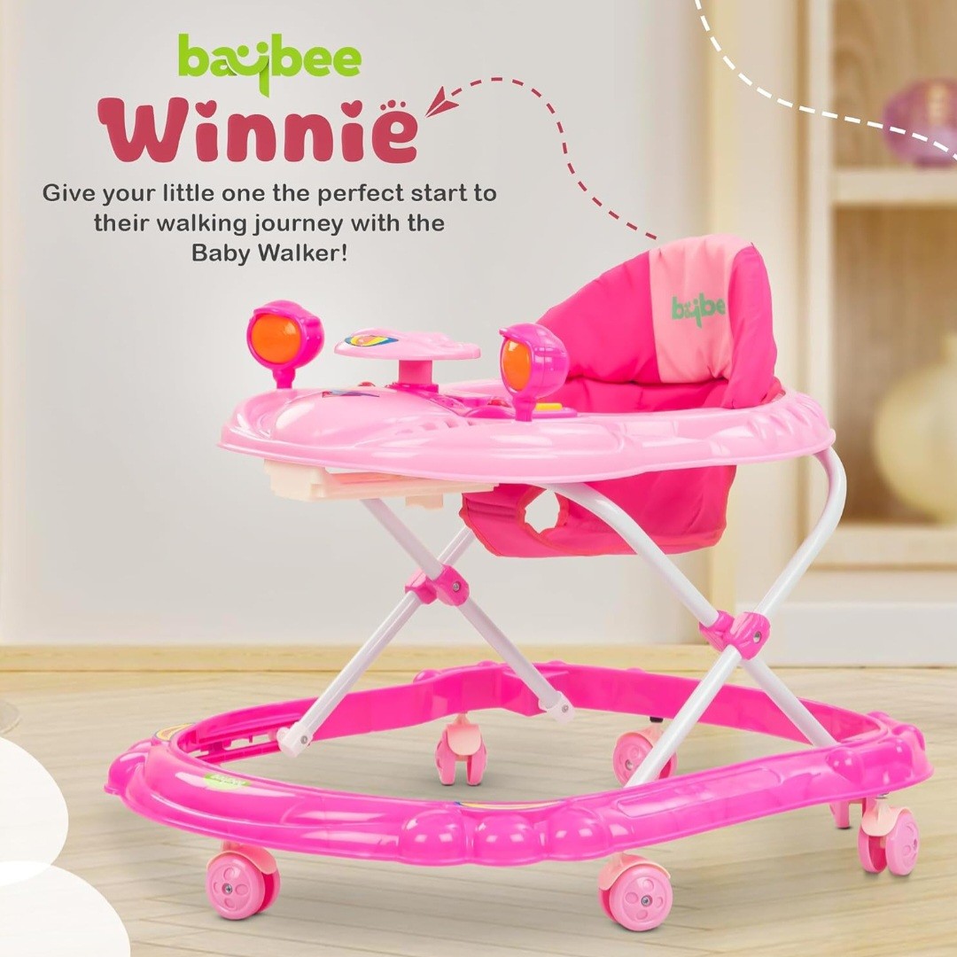 ? Musical Toy Bar with Rattles: The Baybee Winnie Baby Walker includes an engaging musical toy bar featuring a variety of rattles and interactive elements. These toys are designed to stimulate your baby's senses, promoting auditory and visual development. The cheerful sounds and colorful designs keep your baby entertained, making playtime both fun and educational. Watch as your baby reaches out and explores, enhancing their motor skills and hand-eye coordination with every touch