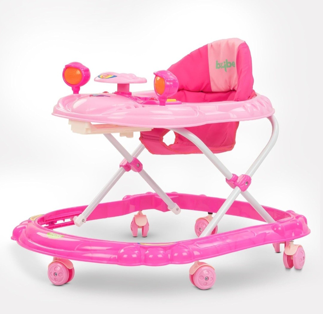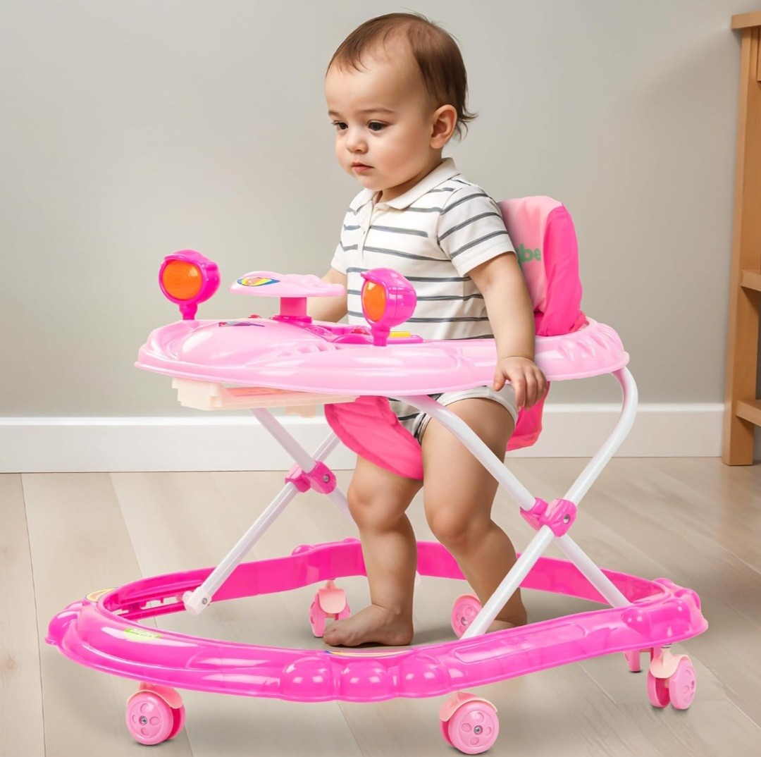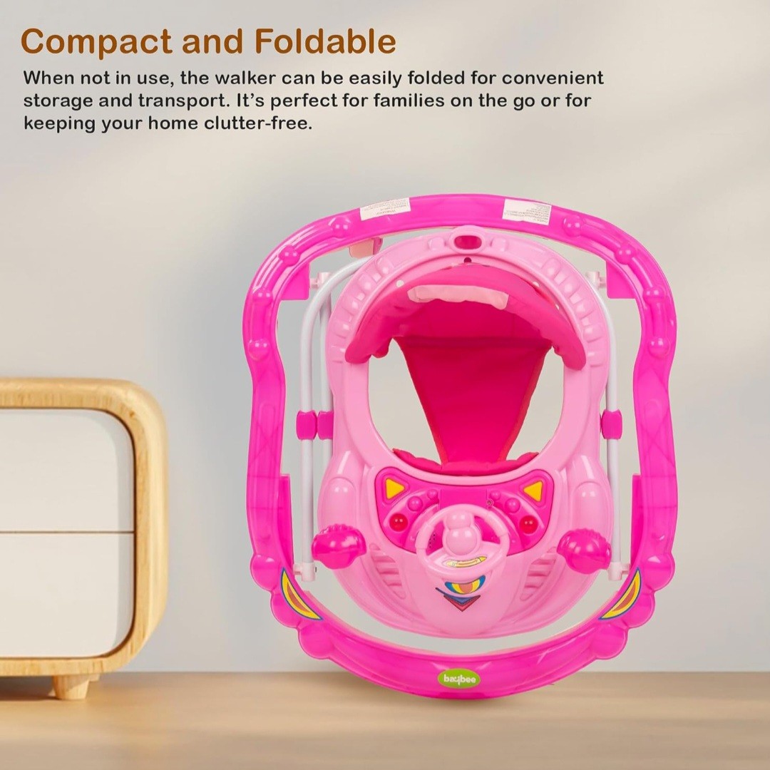 ? Musical Toy Bar with Rattles: The Baybee Winnie Baby Walker includes an engaging musical toy bar featuring a variety of rattles and interactive elements. These toys are designed to stimulate your baby's senses, promoting auditory and visual development. The cheerful sounds and colorful designs keep your baby entertained, making playtime both fun and educational. Watch as your baby reaches out and explores, enhancing their motor skills and hand-eye coordination with every touch