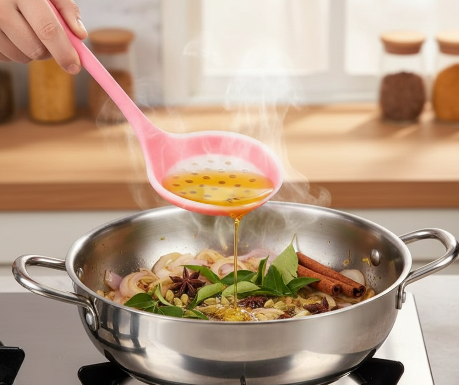 The Fully Silicone Oil Spoon is designed for safe and precise pouring of oil, sauces, and gravies while cooking. Made from high-quality food-grade silicone, it is heat resistant and safe to use with non-stick cookware.