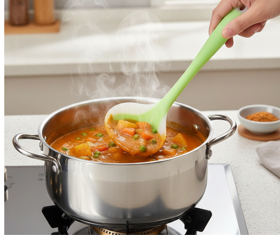 Perfect for serving soup, curry, porridge, sauces, and gravies, it prevents scratches on pots and pans. The ergonomic handle provides a comfortable grip, making cooking easier and safer.
