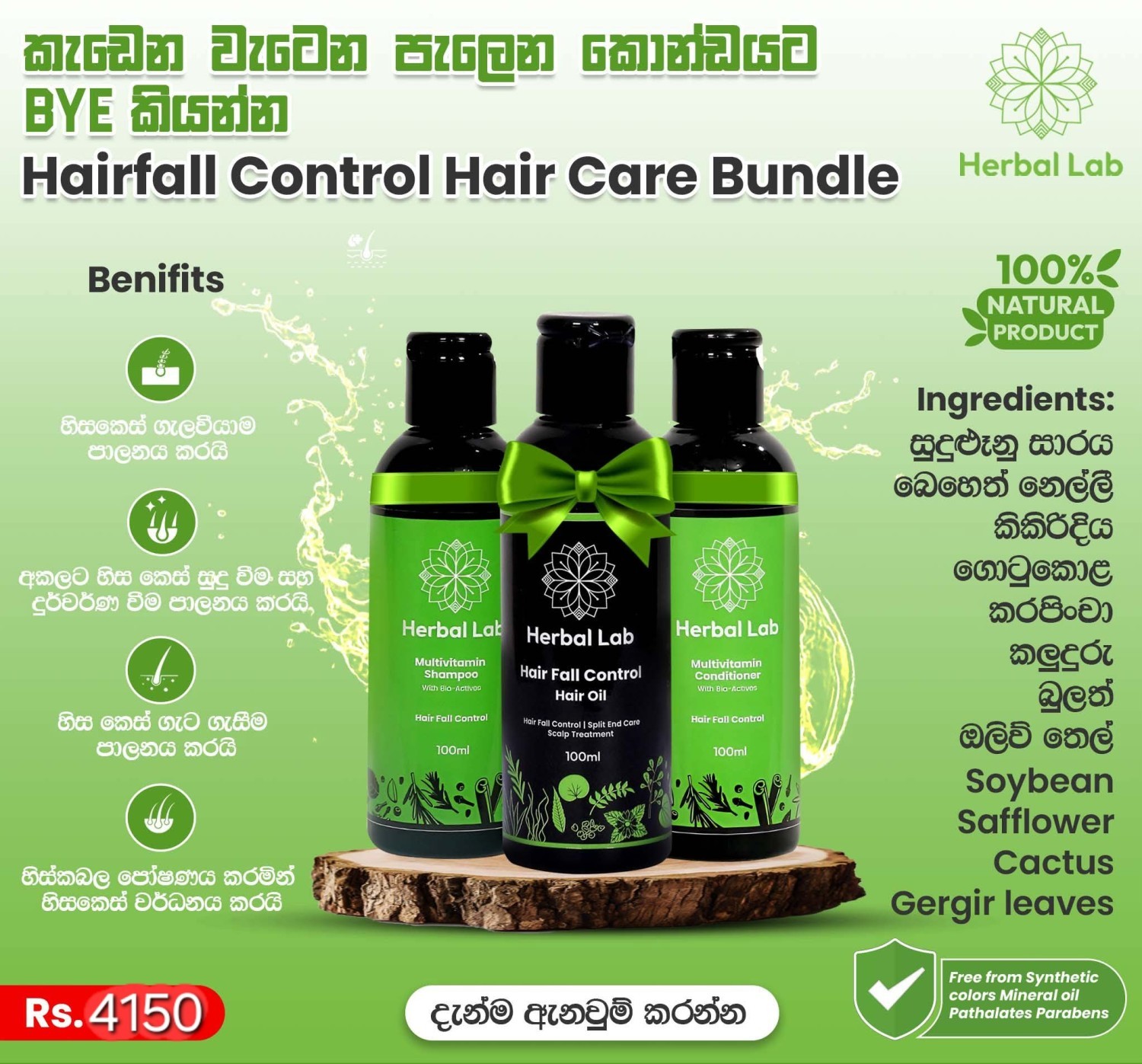 හිසකෙස් කැඩීයාමේ පැලීයාමේ කරදර සියල්ල මට්ටු කරන සියලූම හිසකෙස් සත්කාර සමඟින් කැඩෙන්නෙ වැටෙන්නෙ නැති නිරෝගී මෙන්ම පිරිපුන් ලස්සන කොන්ඩයක් ලබාගන්න ඖෂධීය ඔසු රැසක් එක්කොට ඔබ වෙත එන Herbal Lab Hairfall Control Hair Care Bundle. කොන්ඩෙ යන කරදරේ නැති කරගන්න හැමදේම කරලත් හිතට දැනෙන ප්රතිඵලය නැති අයට නිට්ටාවටම ප්රතිඵල දෙන ප්රත්යක්ෂ Hair Care Bundle එක.