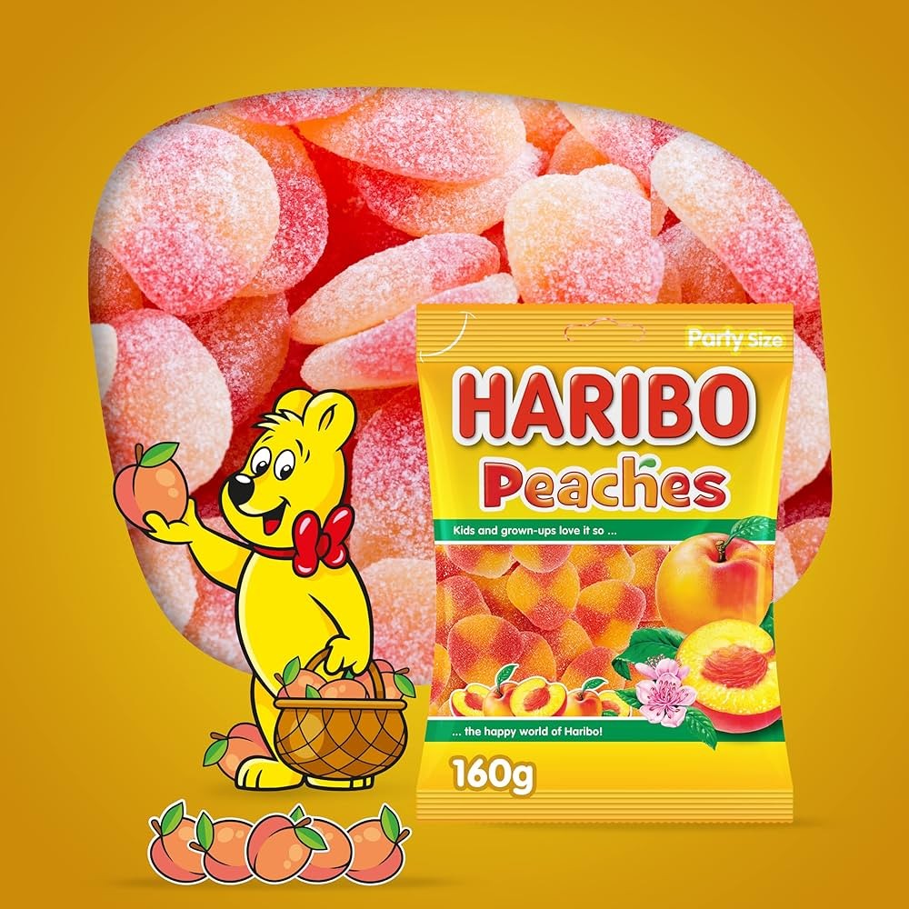 Enjoy the sweet and tangy flavor of Haribo Peaches 160g – soft, chewy gummy candies shaped like juicy peaches. Bursting with fruity taste, these gummies are perfect for snacking, sharing, or adding a fun twist to parties and gift bags. Loved by kids and adults alike, Haribo Peaches are a classic treat for every candy lover.