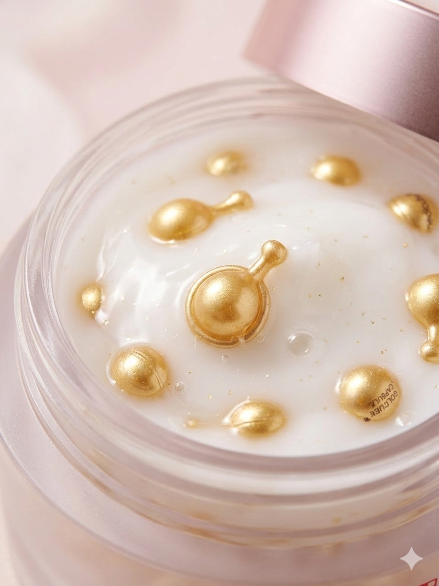 A unique cream infused with visible capsules that dissolve into a silky, hydrating finish upon contact with the skin.