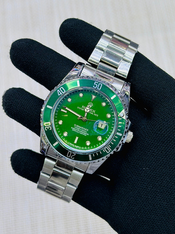 Luxury Rolex Sub Date men’s watch with silver case and green dial