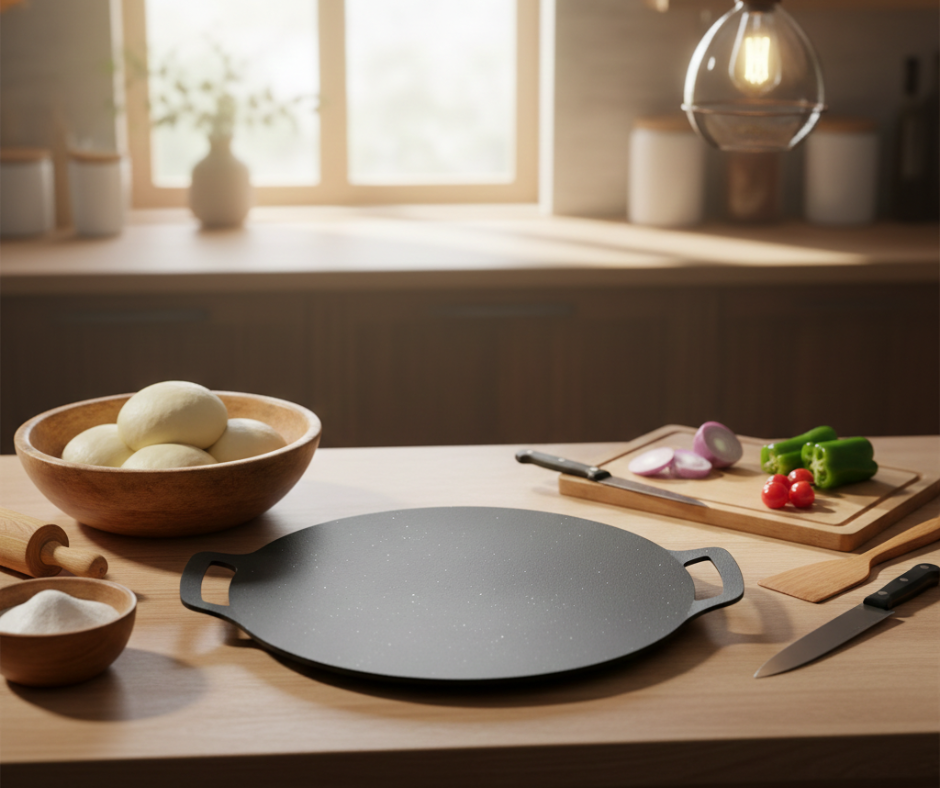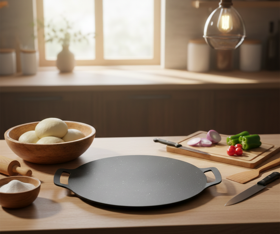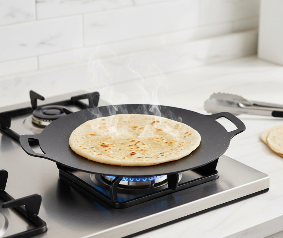 The Round Rotti Tawa – 28cm is designed for smooth and even cooking of roti, chapati, dosa, pancakes, and other flatbreads. Its large 28cm surface provides enough space for easy flipping and even heat distribution.