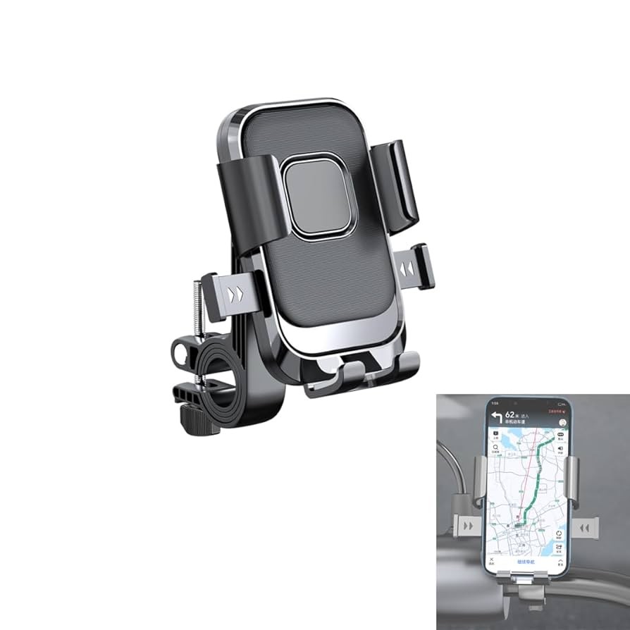 Featuring a mirror-mount design, the holder easily attaches to your bike’s mirror rod for stable positioning and convenient viewing. The adjustable grip fits most smartphones, offering 360° rotation for optimal viewing angles — whether you prefer portrait or landscape mode.