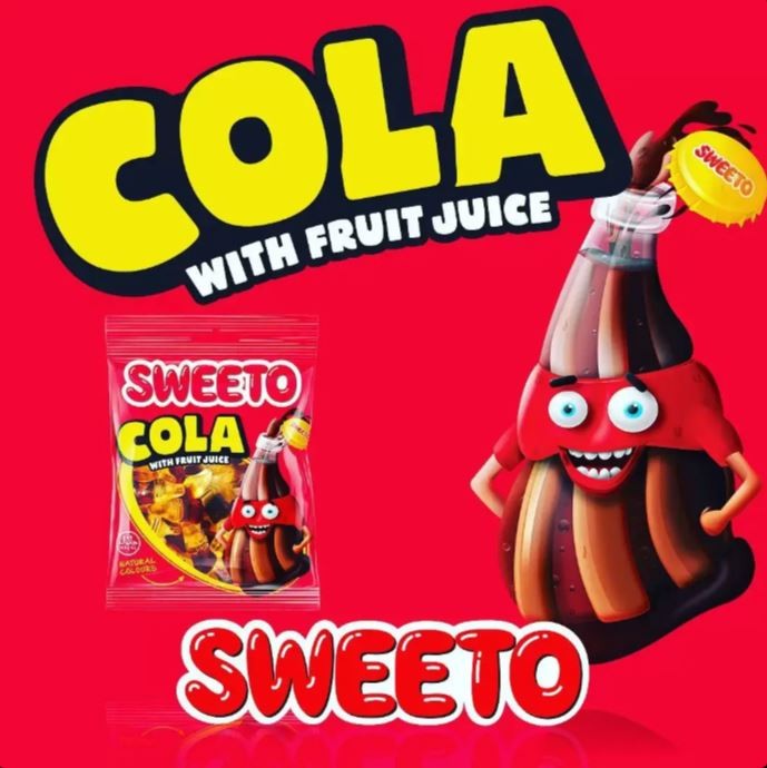 Enjoy the fizzy sweetness of Sweeto Cola with Fruit Juice 80G – cola fun in every chewy bite!