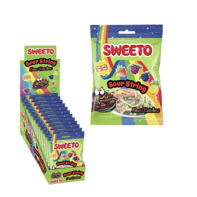 Add a tangy twist to your snack time with Sweeto Sour Rainbow Strings 80G! These colorful, sour gummy strings are bursting with fruity flavors, making every bite a fun and zesty treat.