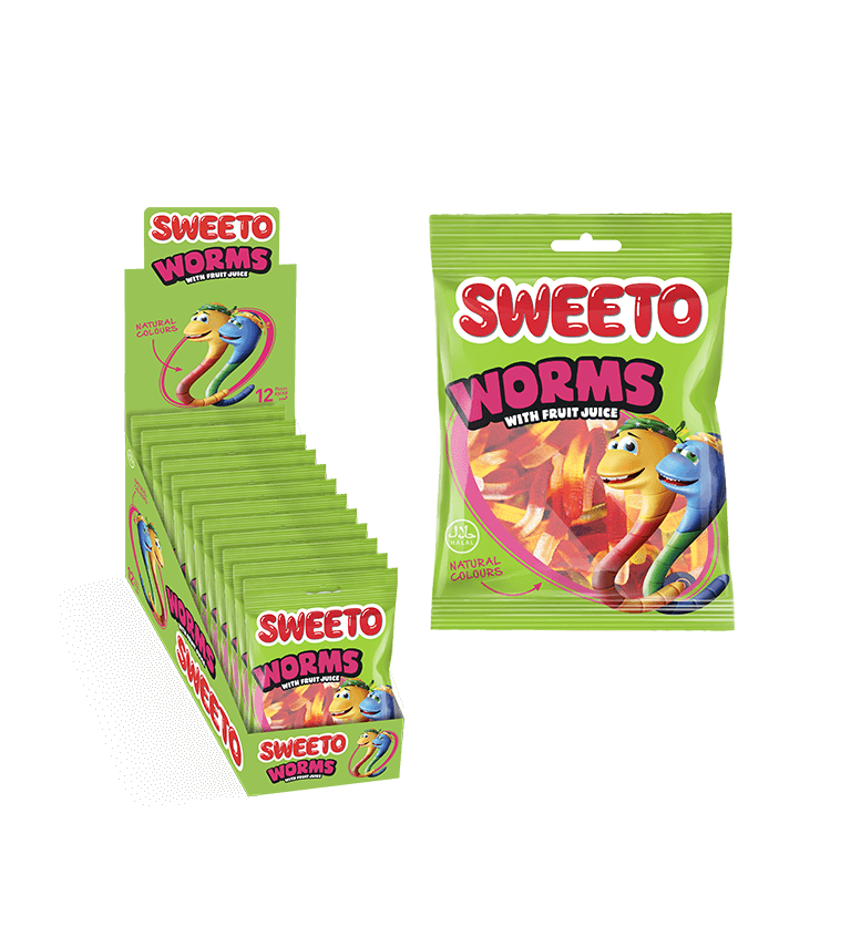 Enjoy the playful sweetness of Sweeto Worms with Fruit Juice 80G – fruity, chewy fun in every bite!