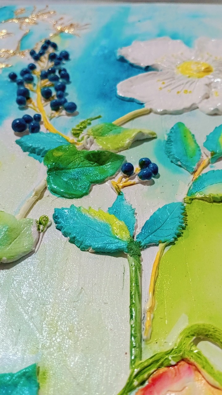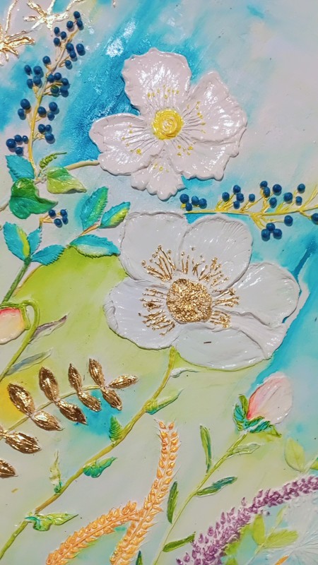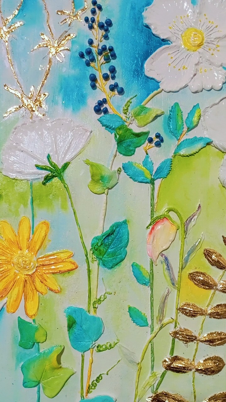 • With acrylic colors , modeling paste, acrylic putty and gold foil
