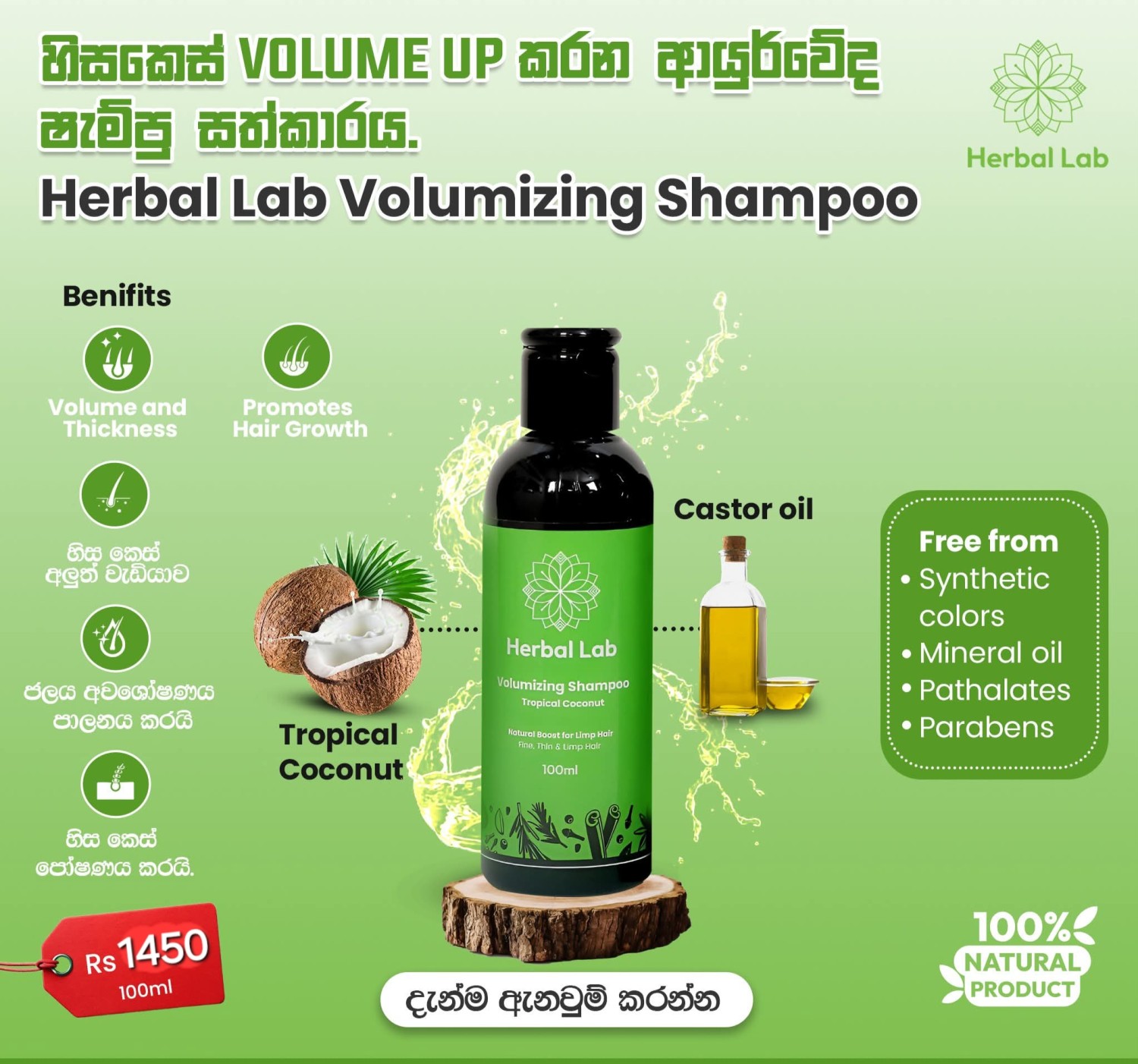 ඔබේ හිසකෙස් volume එක වැඩි කිරිමේ බලවත් ආයුර්වේද ඔසු ගුන ඇති පොල් සහ එඬරුතෙල් එක්කොට ඔසු ගුණ නොනැසෙන සේ නවීන නිෂ්පාදන ප්රමීතීන්ට අනුකූලව නිෂ්පාදනය කරනු ලබන ආයුර්වේදී ෂැම්පු සත්කාරය Herbal Lab Volumizing Shampoo.